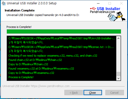 상당한 시간이 경과된 후에 작업이 완료되면 위 사진과 같은 상태가 됩니다. Close 버튼만 클릭하면 작업이 완성됩니다.