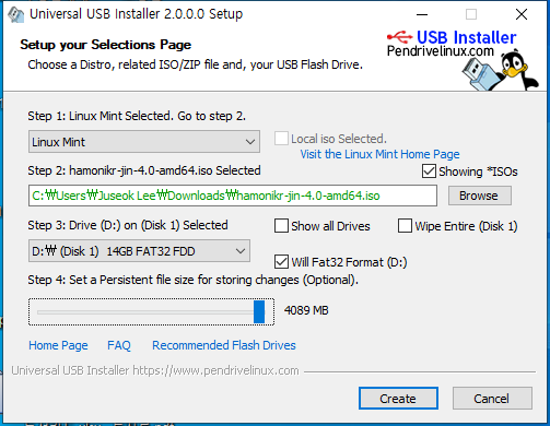 Step3에서 부팅 usb를 지정하고, 마지막으로 Step4에서 Persistent file size를 최대로 설정해 줍니다. 이렇게 Persistent file size를 지정해야만 포터블 기기(usb) 자체에 작업 내용이나 변경 내용을 저장할 수 있습니다.