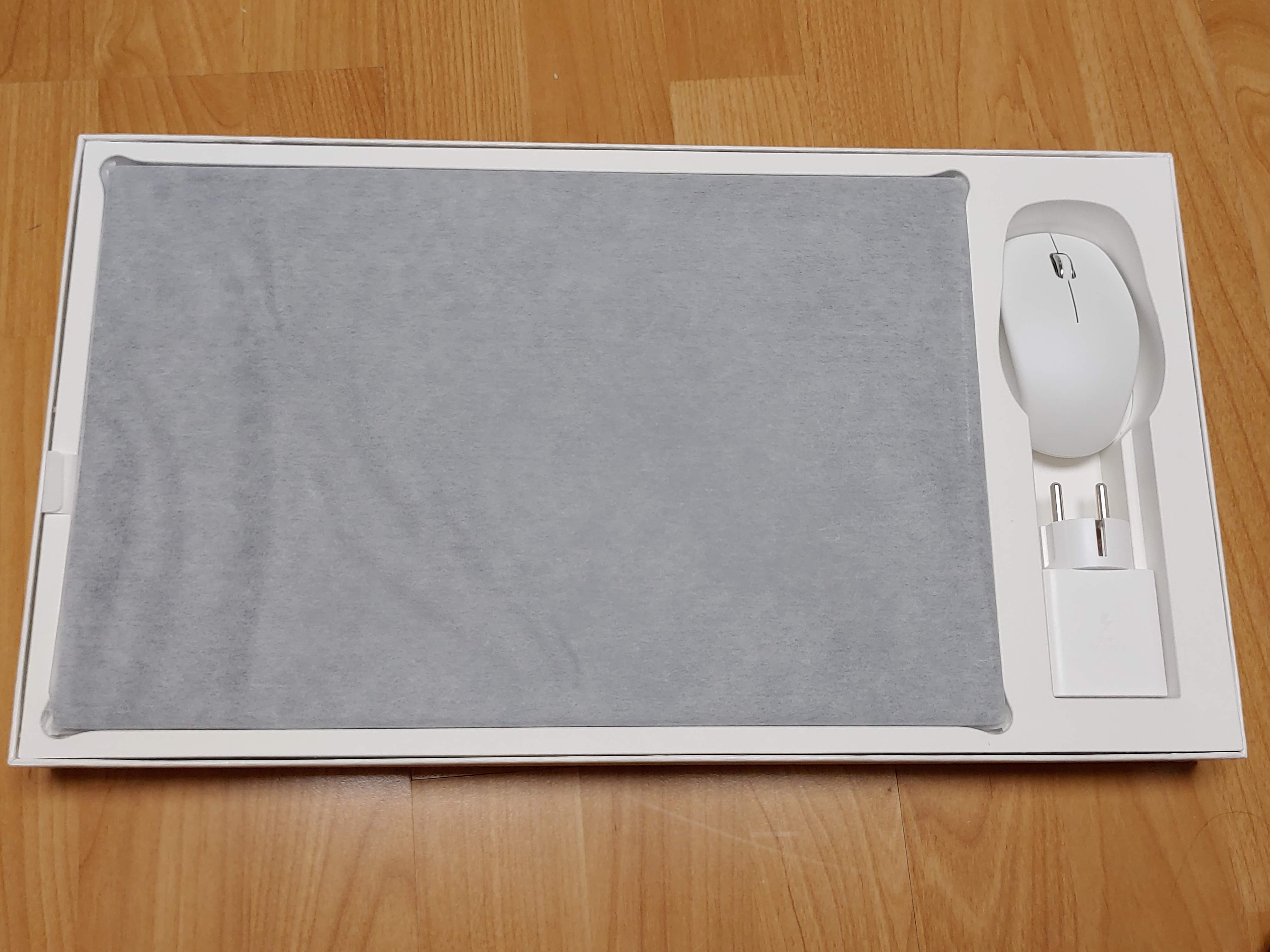 박스를 개봉하면 본체와 블루투스 무선 마우스 그리고 충전 어댑터가 들어 있습니다.