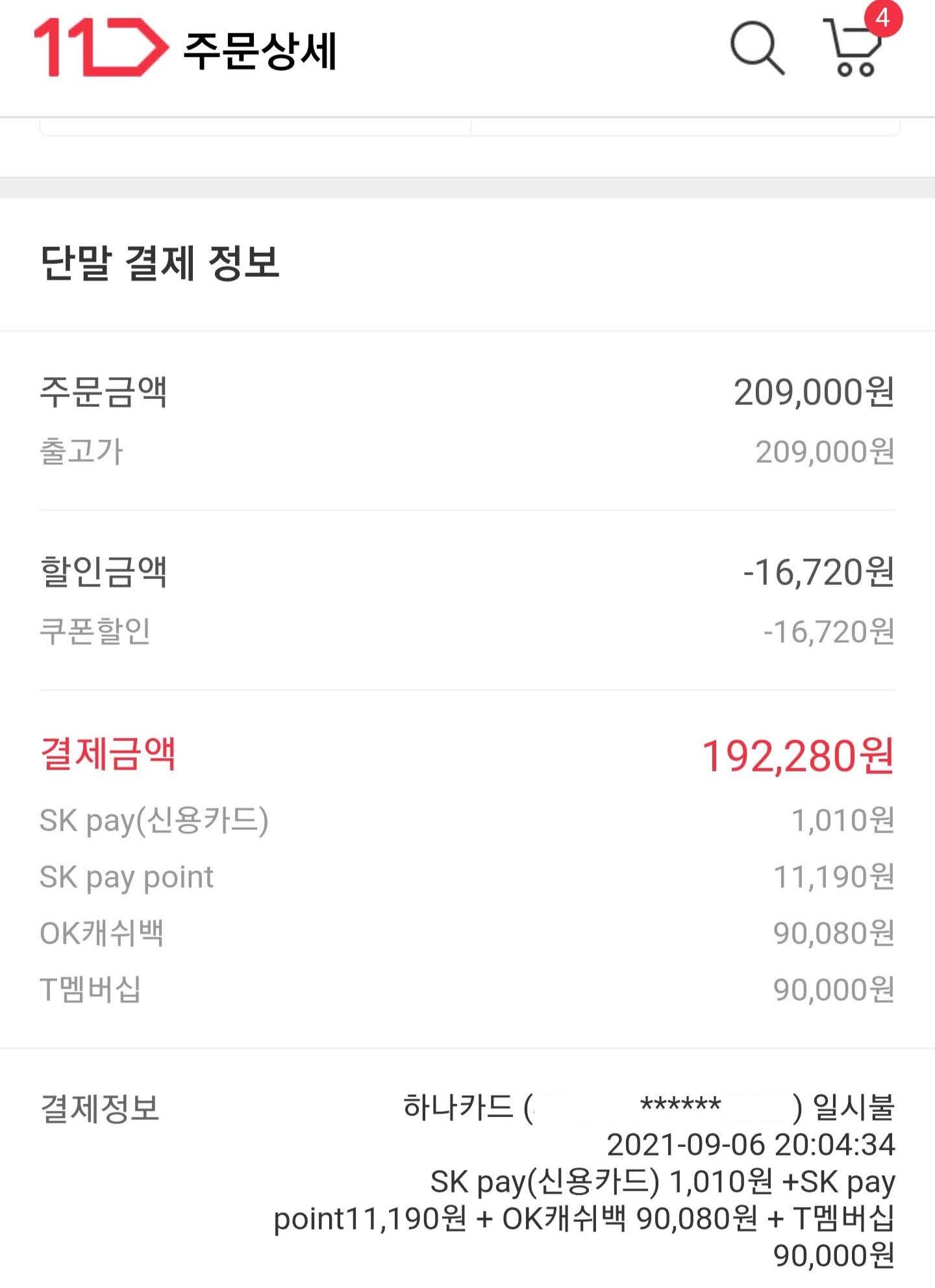 출고가가 209,000원인데, 카드사 할인이 8%되어 16,720원이 할인되었습니다.