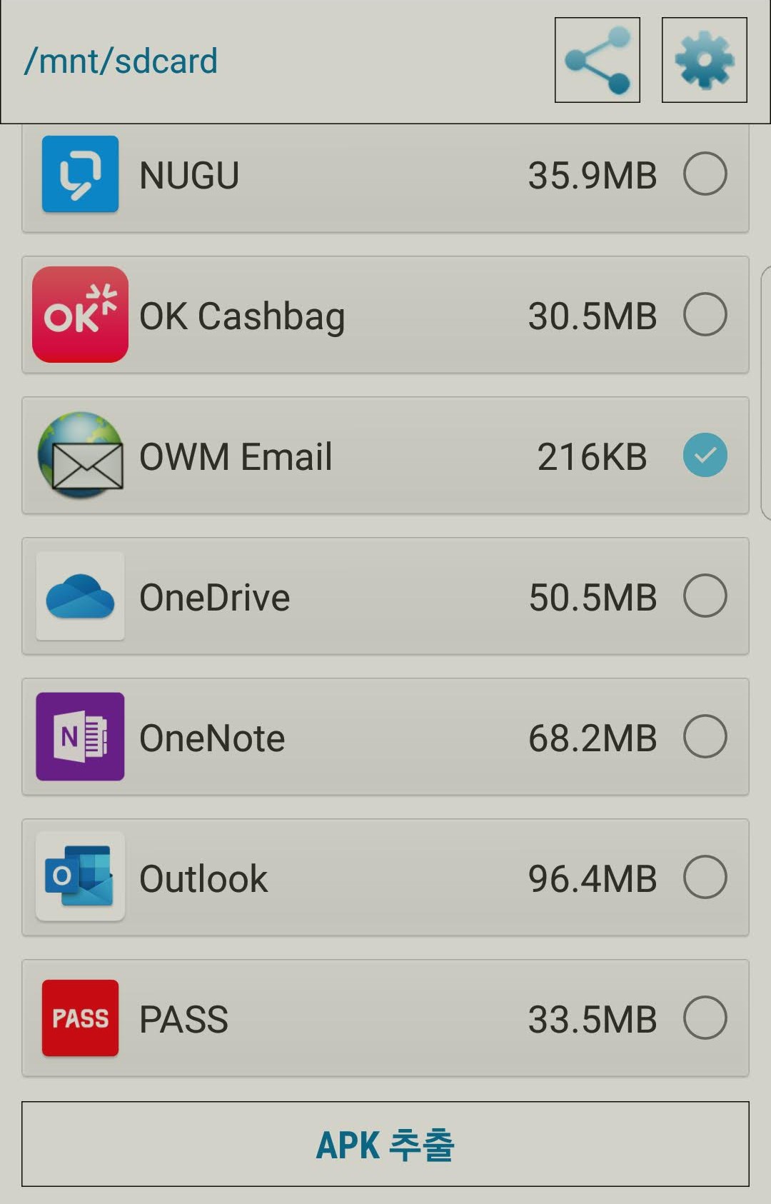 화면 상단에는 추출된 어플이 저장되는 경로가 지정되어 있습니다.